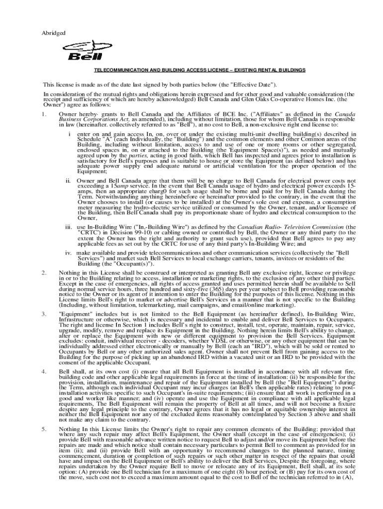 AbridgedTELECOMMUNICATION AND BUILDING ACCESS LICENSE EXISTING RENTAL BUILDINGSThis license is made as of the date last signed by both parties below (the \” Effective Date\”). In consideration