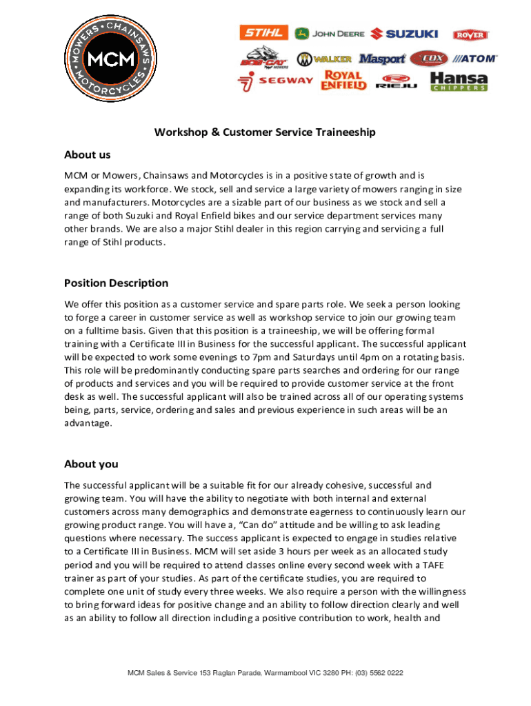 Workshop & Customer Service Traineeship About us MCM or Mowers, Chainsaws and Motorcycles is in a positive state of growth and is expanding its workforce. We stock, sell and service a large variety