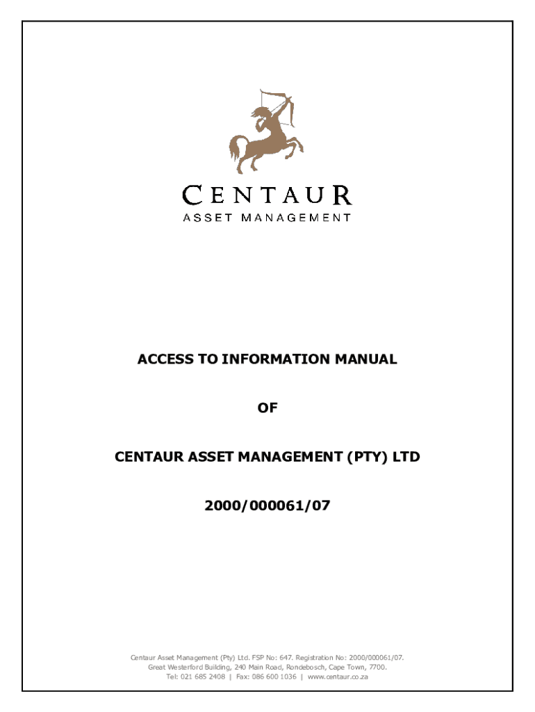 ACCESS TO INFORMATION MANUAL OF CENTAUR ASSET MANAGEMENT (PTY) LTD 2000/000061/07Centaur Asset Management (Pty) Ltd. FSP No: 647. Registration No: 2000/000061/07. Great Wester ford Building, 240 Main