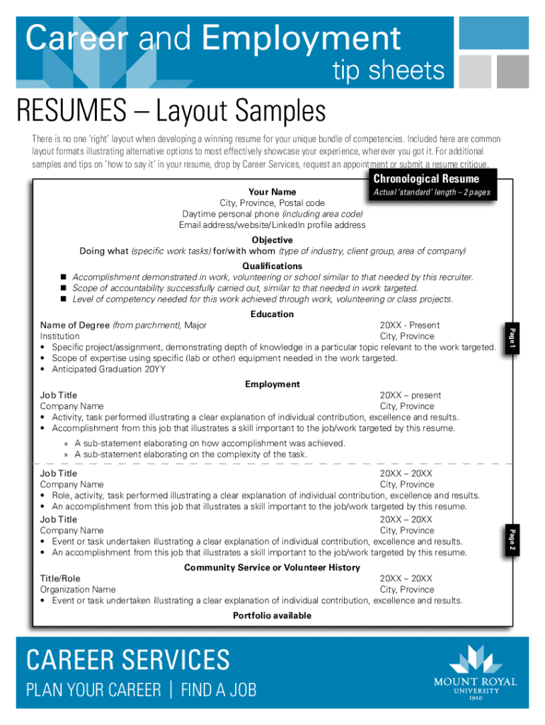 Career and Employment tip sheetsRESUMES Layout Samples There is no one right layout when developing a winning resume for your unique bundle of competencies. Included here are common layout formats