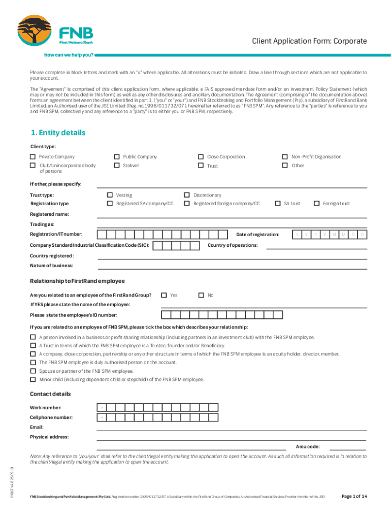 Get the free Client Application Form: Corporate 1. Entity details - downloads fnbsecurities co