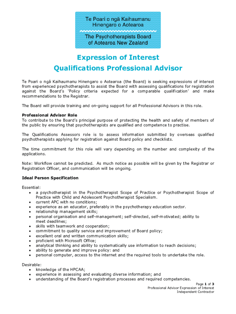 Get the free Expression of Interest Qualifications Professional Advisor - pbanz org
