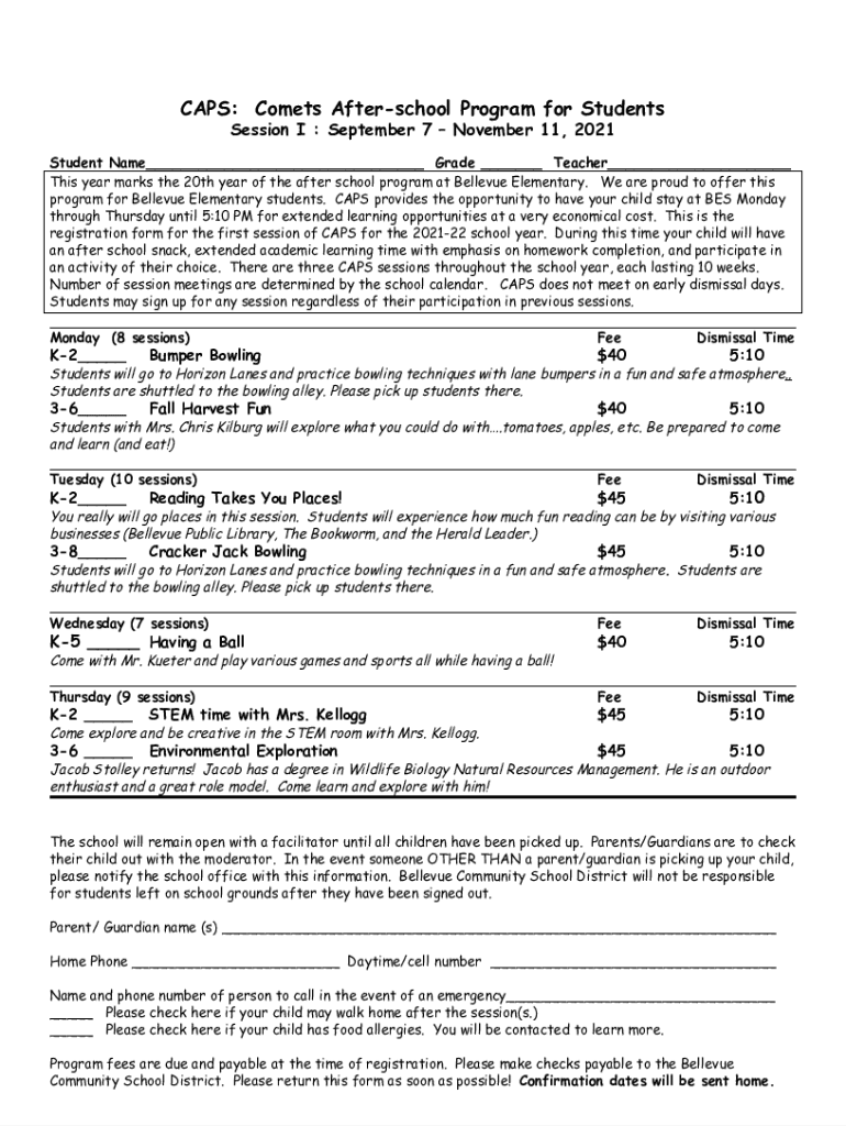 CAPS: Comets After school Program for Students Session I: September 7 November 11, 2021, Student Name___ Grade ___ Teacher___ This year marks the 20th year of the after school program at Bellevue