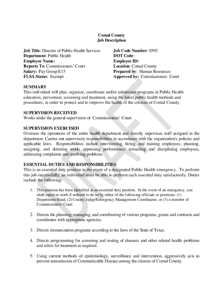 Coal County Job Description Job Title: Director of Public Health Services Department: Public Health Employee Name: Reports To: Commissioners Court Salary: Pay Group E15 FLEA Status: Exempt Job Code
