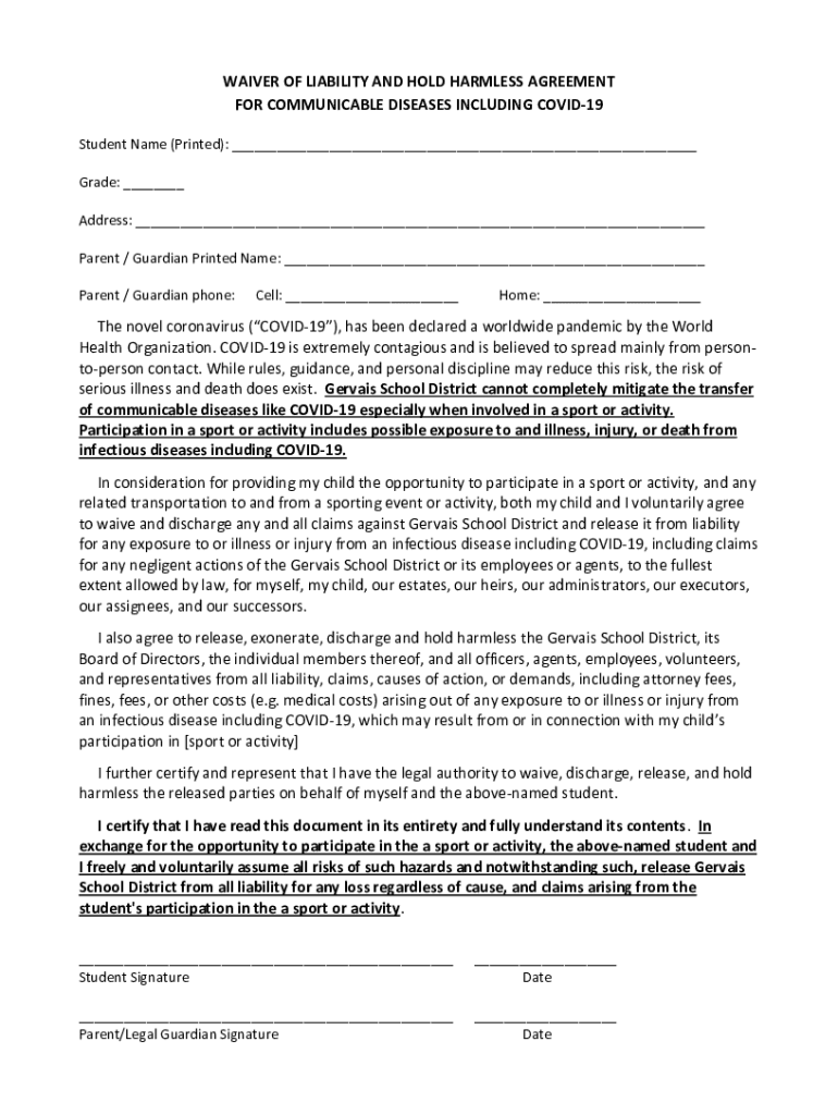 WAIVER OF LIABILITY AND HOLD HARMLESS AGREEMENT FOR COMMUNICABLE DISEASES INCLUDING COVID-19 Student Name (Printed): ___ Grade: ___ Address: ___ Parent / Guardian Printed Name: ___ Parent / Guardian