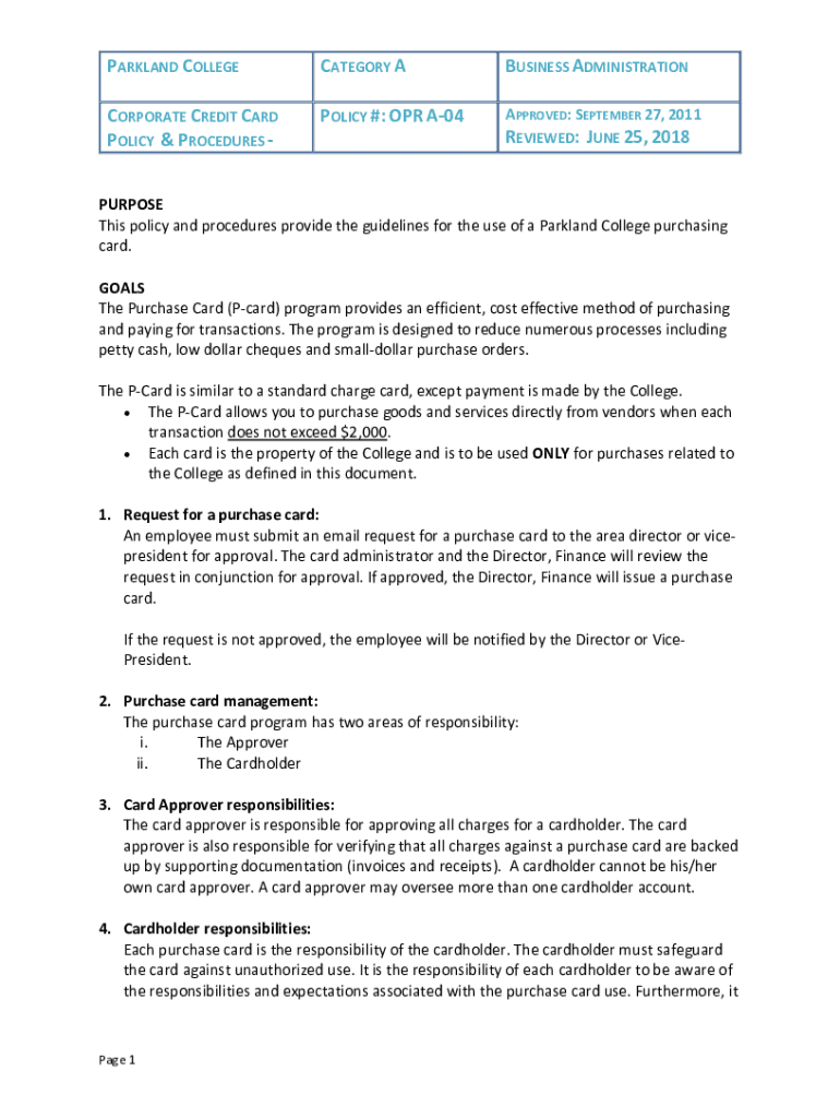 PARKLAND COLLEGECATEGORY BUSINESS ADMINISTRATIONCORPORATE CREDIT CARD POLICY & PROCEDURES POLICY #: OR A04APPROVED: SEPTEMBER 27, 2011REVIEWED: JUNE 25, 2018PURPOSE This policy and procedures provide