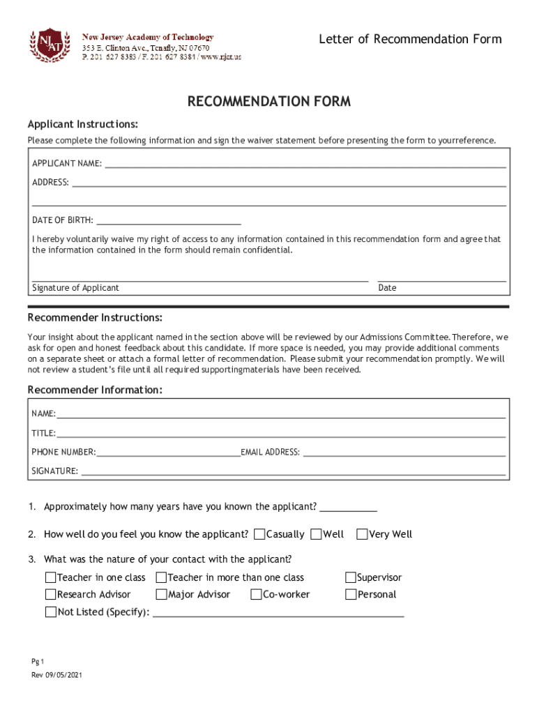The recommendation form - njat may require information such as the recommender's name, contact information, relationship to the person or entity being recommended, and a detailed explanation of the recommendation.