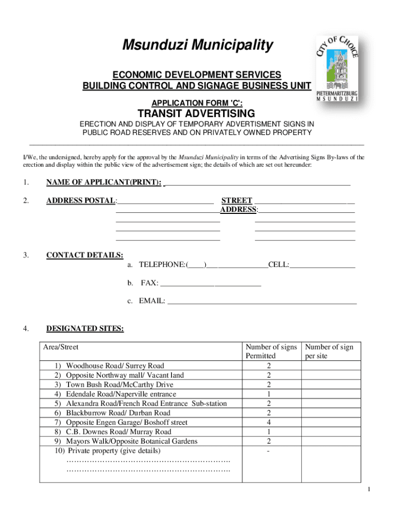 Kunduz Municipality ECONOMIC DEVELOPMENT SERVICES BUILDING CONTROL AND SIGNAGE BUSINESS UNIT APPLICATION FORM \'C\':TRANSIT ADVERTISING ERECTION AND DISPLAY OF TEMPORARY ADVERTISEMENT SIGNS IN PUBLIC