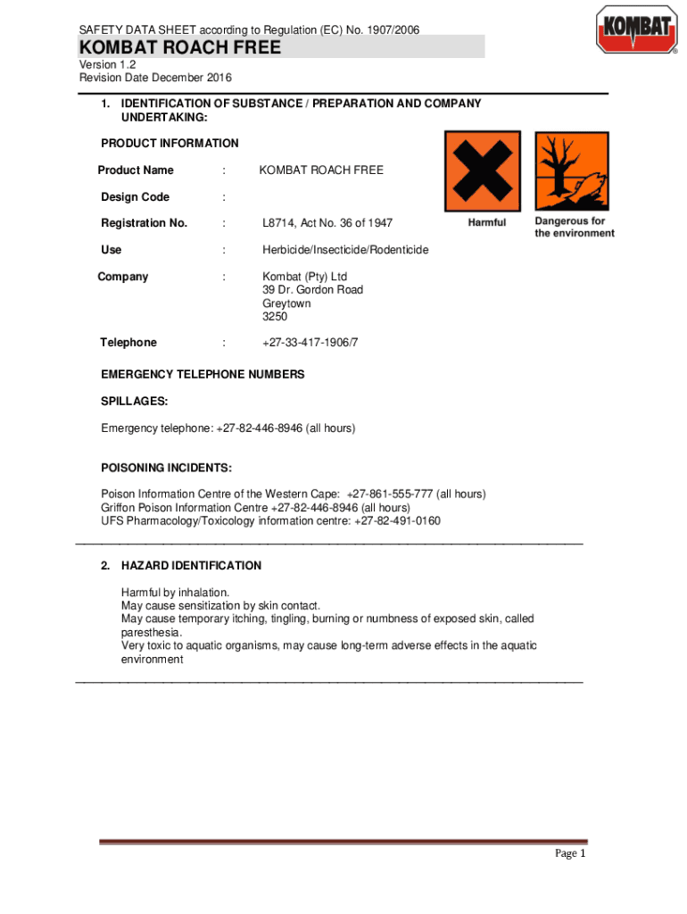 SAFETY DATA SHEET according to Regulation (EC) No. 1907/2006KOMBAT ROACH FREE Version 1.2 Revision Date December 2016 1. IDENTIFICATION OF SUBSTANCE / PREPARATION AND COMPANY UNDERTAKING: PRODUCT