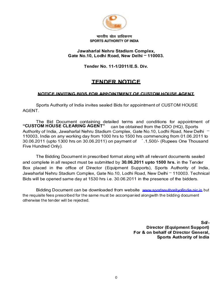 Jawaharlal Nehru Stadium Complex, Gate No.10, Lodi Road, New Delhi 110003. Tender No. 111/2011/E.S. Div. TENDER NOTICE INVITING BIDS FOR APPOINTMENT OF CUSTOM HOUSE AGENT Sports Authority of India
