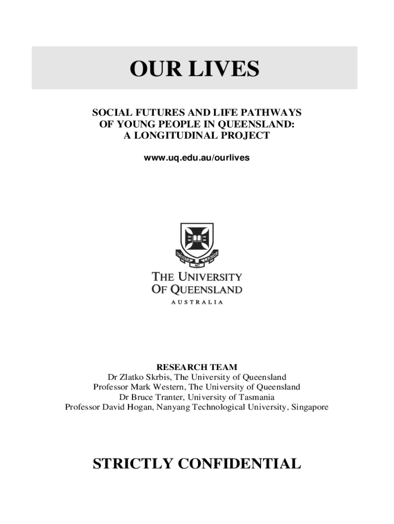 OUR LIVES SOCIAL FUTURES AND LIFE PATHWAYS OF YOUNG PEOPLE IN QUEENSLAND: A LONGITUDINAL PROJECT www.uq.edu.au/ourlivesRESEARCH TEAM Dr Plato Serbia, The University of Queensland Professor Mark Western,