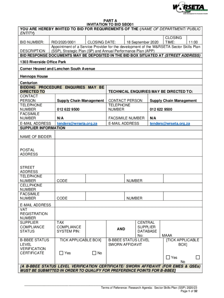 PART A INVITATION TO BID SBD01 YOU ARE HEREBY INVITED TO BID FOR REQUIREMENTS OF THE (NAME OF DEPARTMENT/ PUBLIC ENTITY) CLOSING BID NUMBER: RID/2020/0001 CLOSING DATE: 18 September 2020 TIME: 11:00