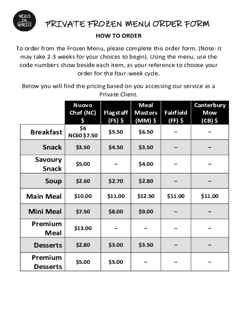 PRIVATE FROZEN MENU ORDER FORM HOW TO ORDER from the Frozen Menu, please complete this order form. (Note: it may take 23 weeks for your choices to begin). Using the menu, use the code numbers show