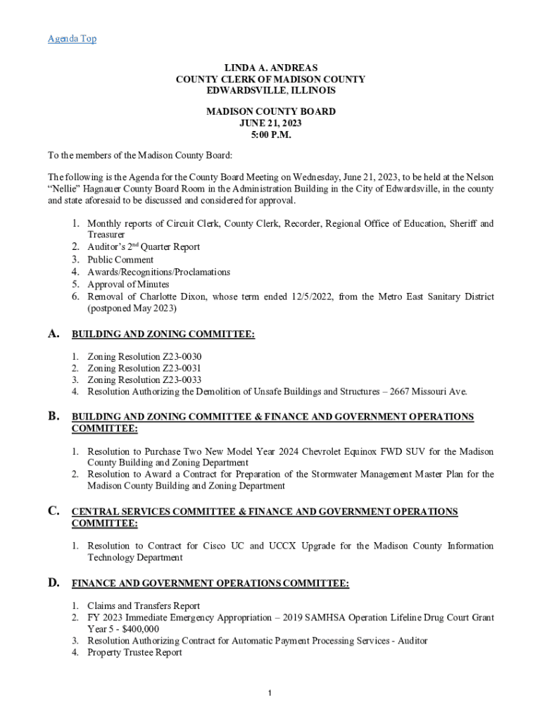Agenda Top LINDA A. ANDREAS COUNTY CLERK OF MADISON COUNTY EDWARDSVILLE, ILLINOIS MADISON COUNTY BOARD JUNE 21, 2023 5:00 P.M. To the members of the Madison County Board: The following is the Agenda