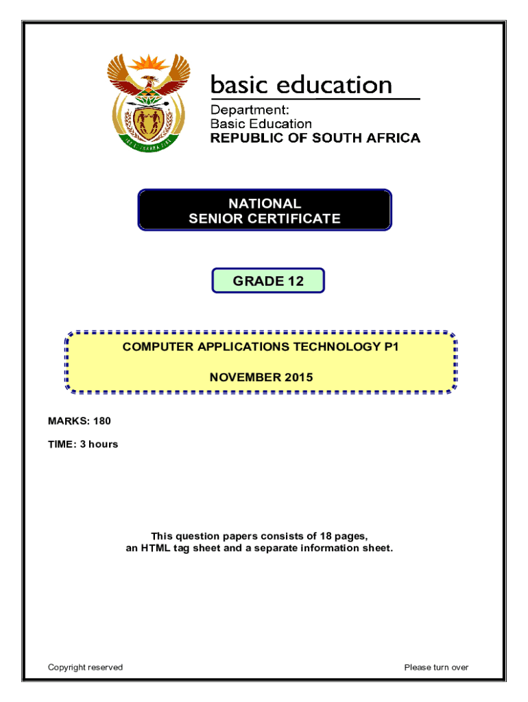 NATIONAL SENIOR CERTIFICATEGRADE 12COMPUTER APPLICATIONS TECHNOLOGY P1 NOVEMBER 2015 MARKS: 180 TIME: 3 fourths question papers consists of 18 pages, an HTML tag sheet and a separate information sheet.