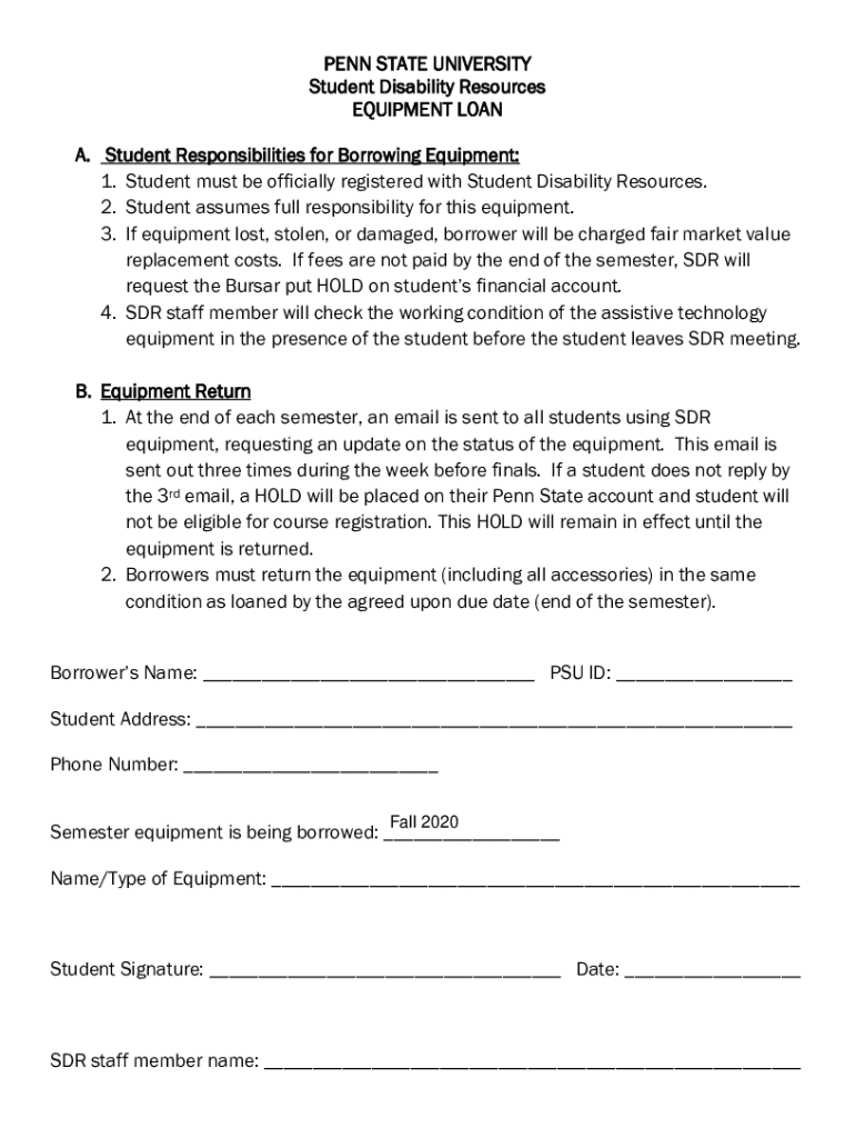 PENN STATE UNIVERSITY Student Disability Resources EQUIPMENT LOAN A. Student Responsibilities for Borrowing Equipment: 1. Student must be officially registered with Student Disability Resources. 2.