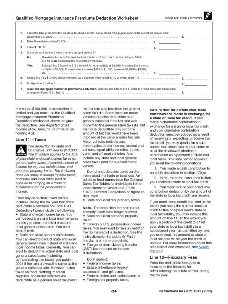 Qualified Mortgage Insurance Premiums Deduction WorksheetKeep for Your Records1. Enter the total premiums the estate or trust paid in 2021 for qualified mortgage insurance for a contract issued after