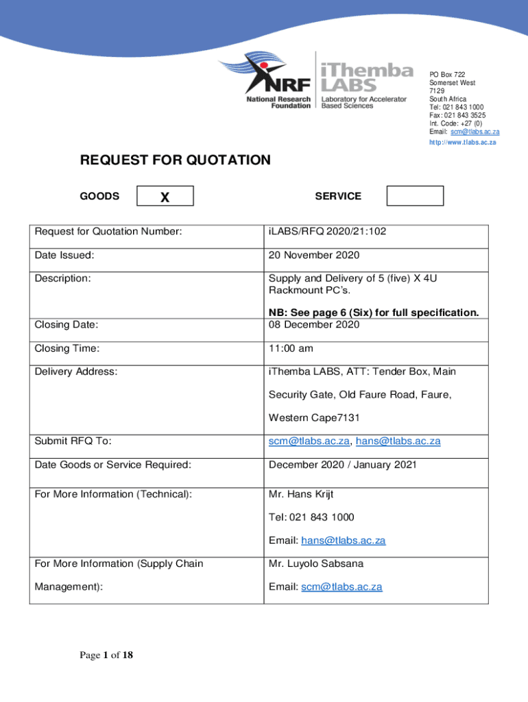 PO Box 722 Somerset West 7129 South Africa Tel: 021 843 1000 Fax: 021 843 3525 Int. Code: +27 (0) Email: scm@tlabs.ac.za http://www.tlabs.ac.zaREQUEST FOR QUOTATION GOODSXSERVICERequest for Quotation
