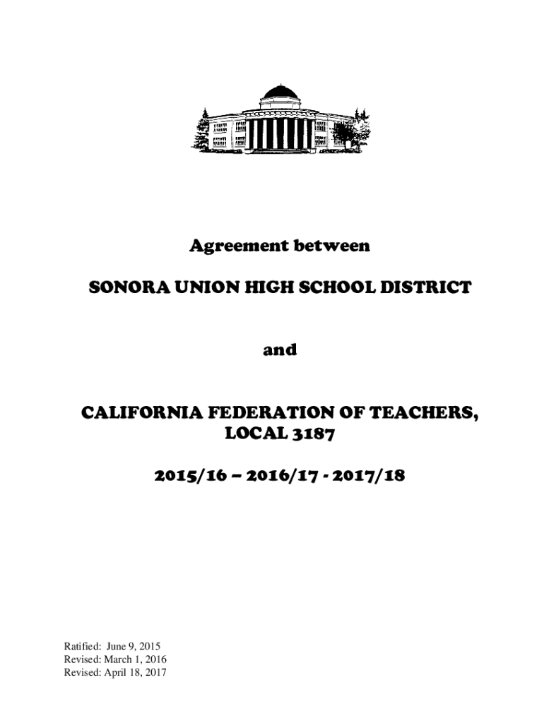 Agreement between SONORA UNION HIGH SCHOOL DISTRICT and CALIFORNIA FEDERATION OF TEACHERS, LOCAL 3187 2015/16 2016/17 2017/18Ratified: June 9, 2015, Revised: March 1, 2016, Revised: April 18, 2017Table