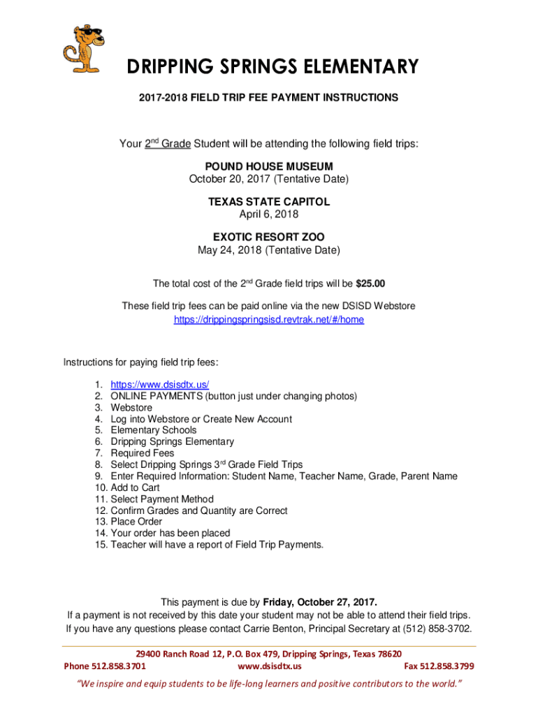 DRIPPING SPRINGS ELEMENTARY 20172018 FIELD TRIP FEE PAYMENT INSTRUCTIONSYour 2nd Grade Student will be attending the following field trips: POUND HOUSE MUSEUM October 20, 2017 (Tentative Date) TEXAS