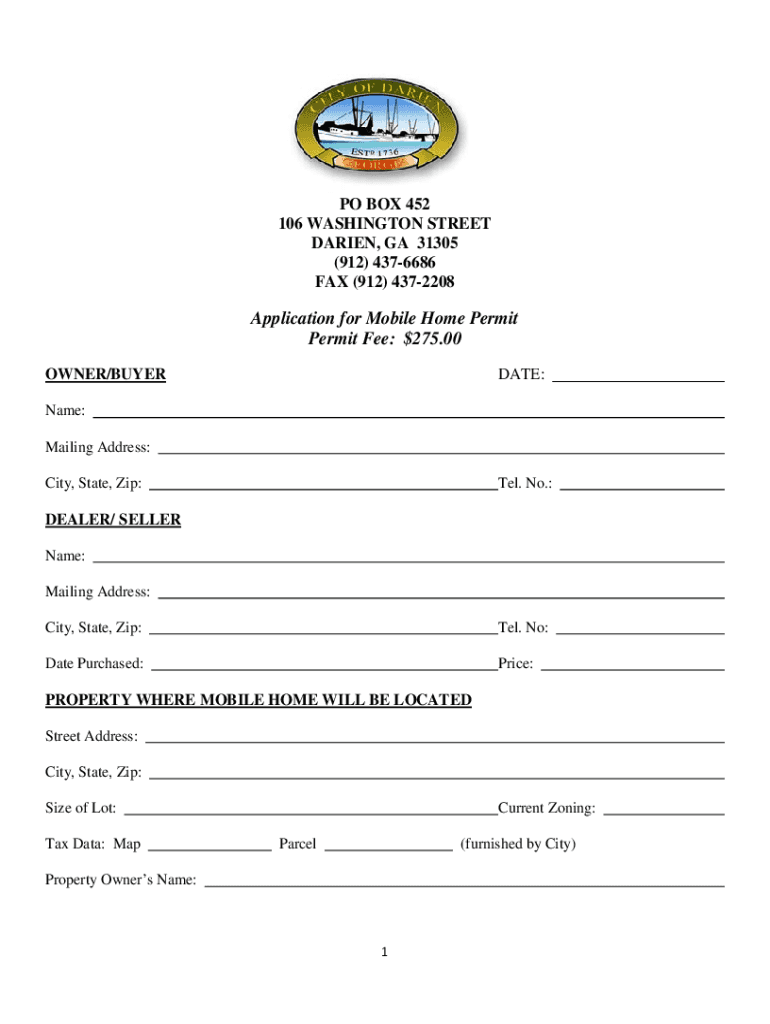 FAX (912) 4372208Application for Mobile Home Permit Fee: $275.00