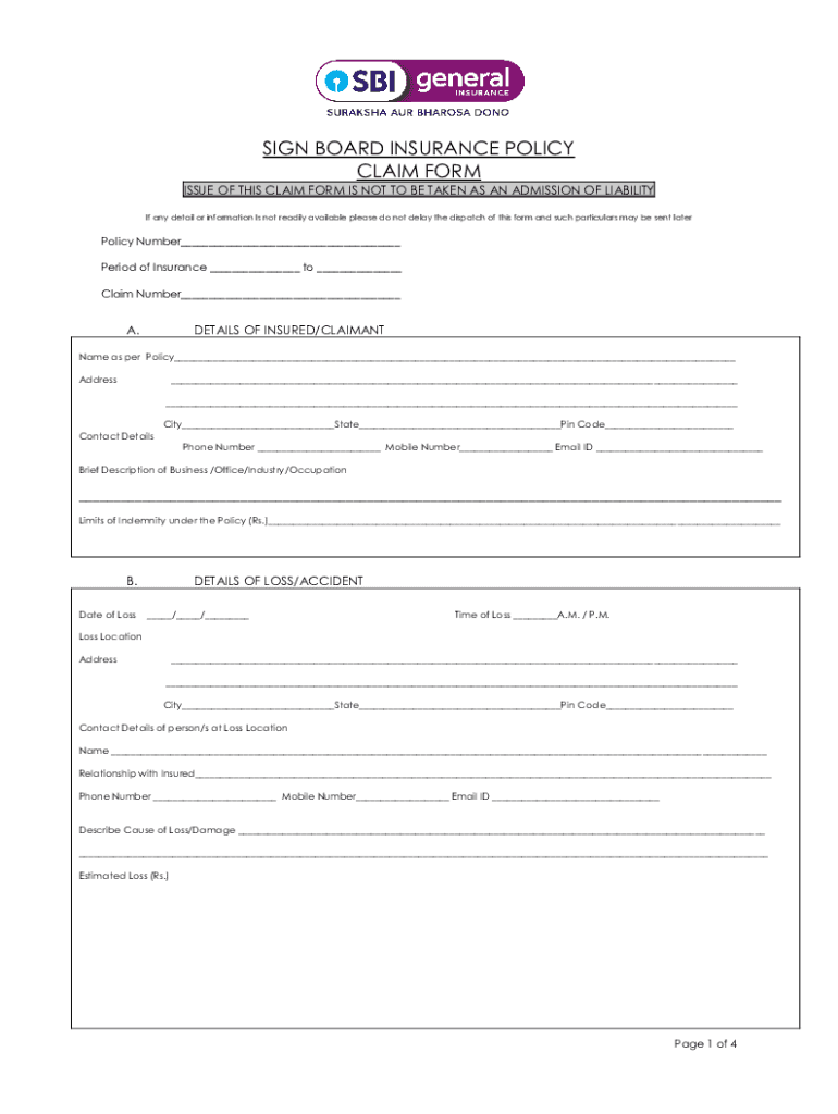 SIGN BOARD INSURANCE POLICY CLAIM FORM ISSUE OF THIS CLAIM FORM IS NOT TO BE TAKEN AS AN ADMISSION OF LIABILITY If any detail or information Is not readily available please do not delay the dispatch