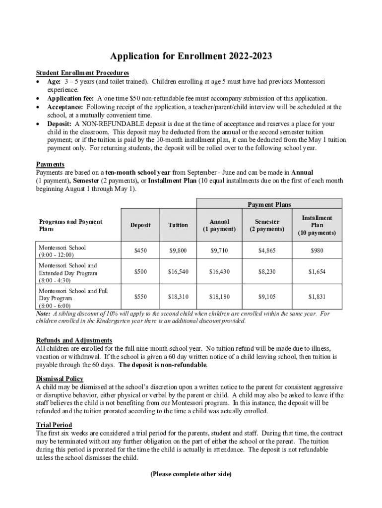 Application for Enrollment 20222023 Student Enrollment Procedures Age: 3 5 years (and toilet trained). Children enrolling at age 5 must have had previous Montessori experience. Application fee: A