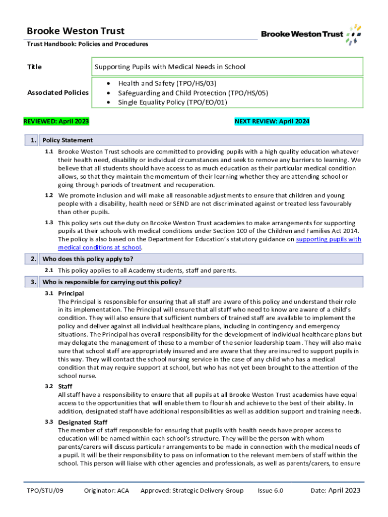 Brooke Weston Trust Handbook: Policies and ProceduresTitleSupporting Pupils with Medical Needs in SchoolAssociated Policies