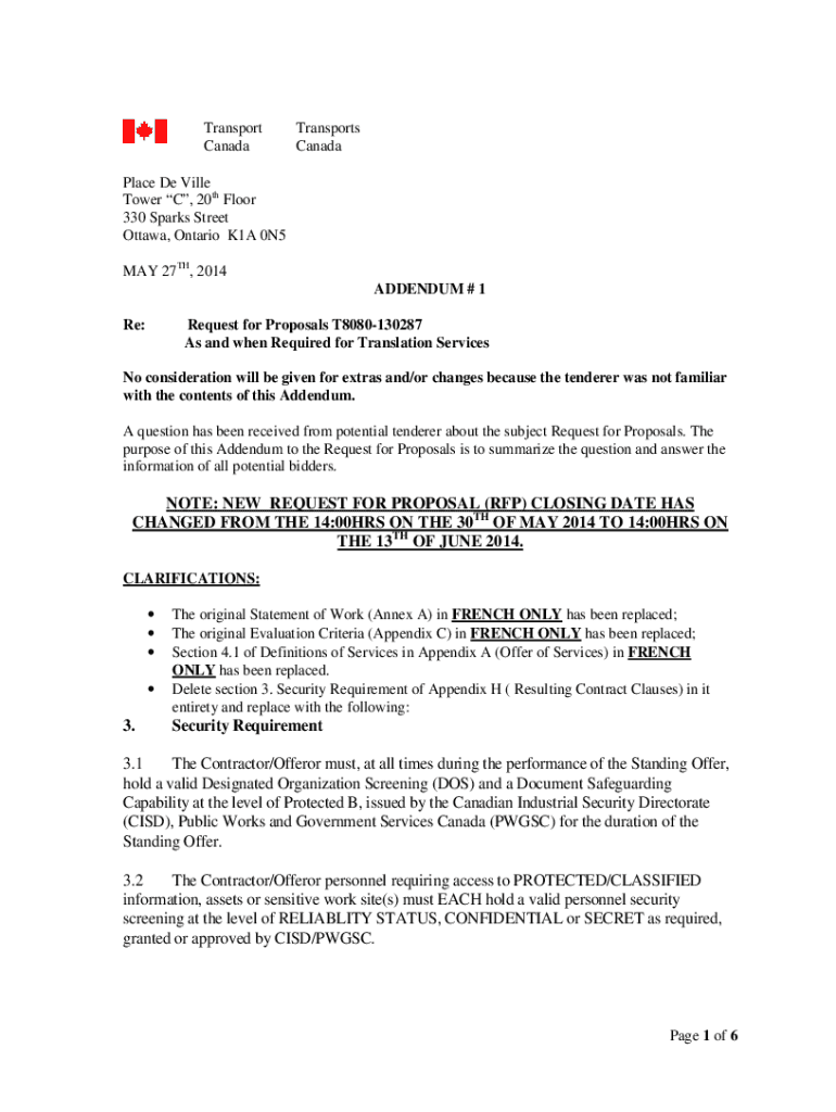 Transport CanadaTransports CanadaPlace De Ville Tower C, 20th Floor 330 Sparks Street Ottawa, Ontario K1A 0N5 MAY 27TH, 2014 ADDENDUM # 1 Re:Request for Proposals T8080130287 As and when Required
