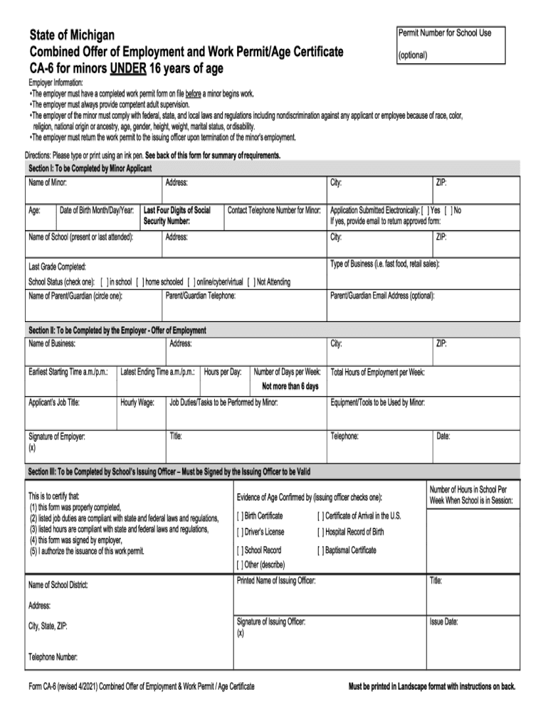 State of Michigan Combined Offer of Employment and Work CA6 for minors UNDER 16 years of permit Number for School Permit/Certificate(optional)Employer Information: The employer must have a completed