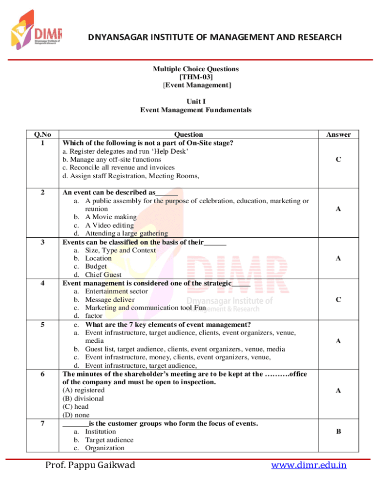 DNYANSAGAR INSTITUTE OF MANAGEMENT AND RESEARCHMultiple Choice Questions [THM03] [Event Management] Unit I Event Management Fundamentals. No 1234567Question Which of the following is not a part of