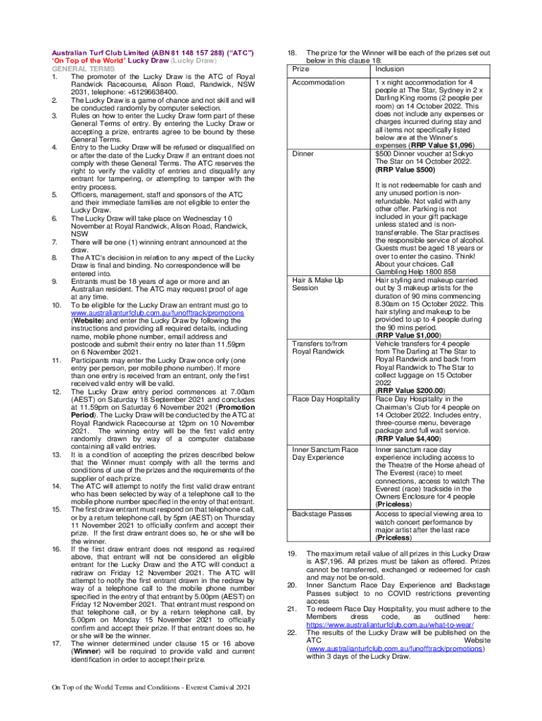 Australian Turf Club Limited (ABN 81 148 157 288) (ATC) On Top of the World Lucky Draw (Lucky Draw) GENERAL TERMS 1. The promoter of the Lucky Draw is the ATC of Royal Rand wick Racecourse, Alison