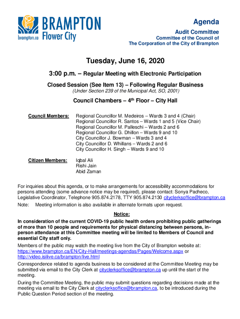 Get the free Audit Committee Agenda for June 16, 2020. City of Brampton - Audit Committee Agenda ...