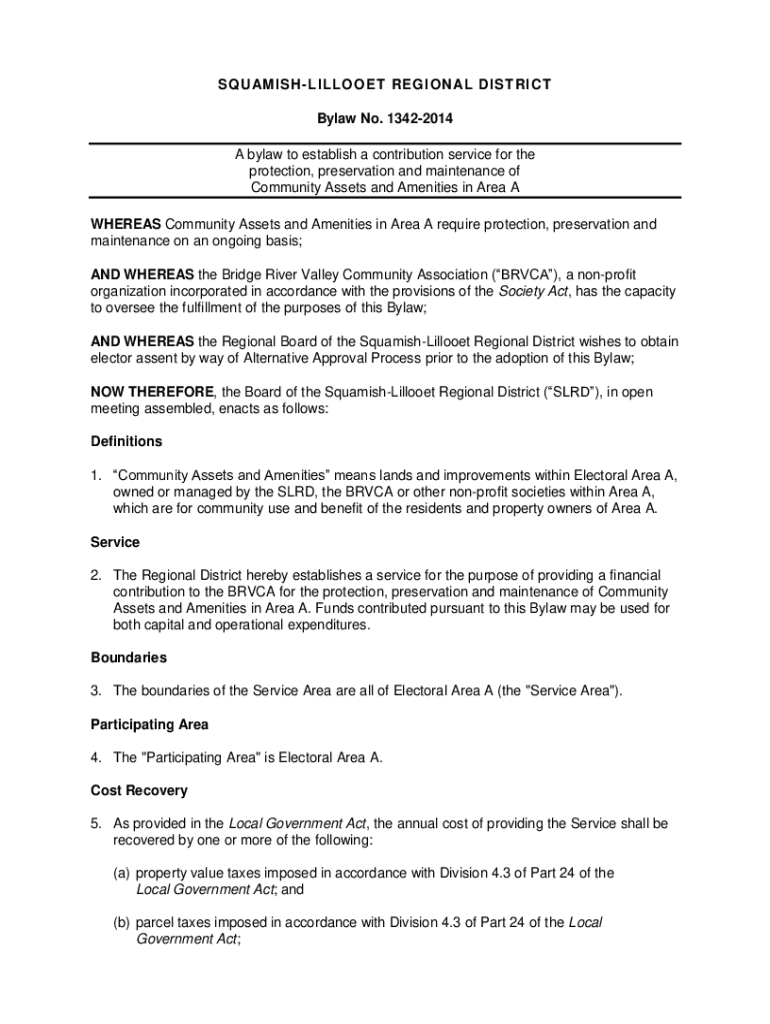 SQUAMISHLILLOOET REGIONAL DISTRICT Bylaw No. 13422014 A bylaw to establish a contribution service for the protection, preservation and maintenance of Community Assets and Amenities in Area A WHEREAS