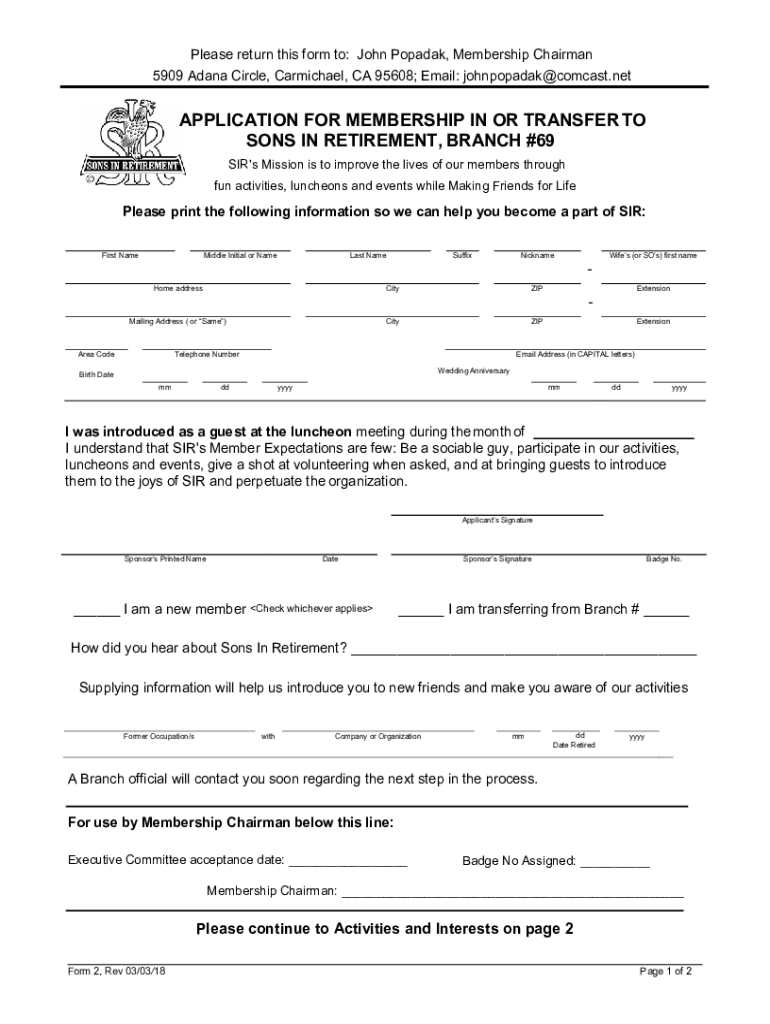 Please return this form to: John Popayán, Membership Chairman 5909 Adana Circle, Carmichael, CA 95608; Email: johnpopadak@comcast.netAPPLICATION FOR MEMBERSHIP IN OR TRANSFER TO SONS IN RETIREMENT,