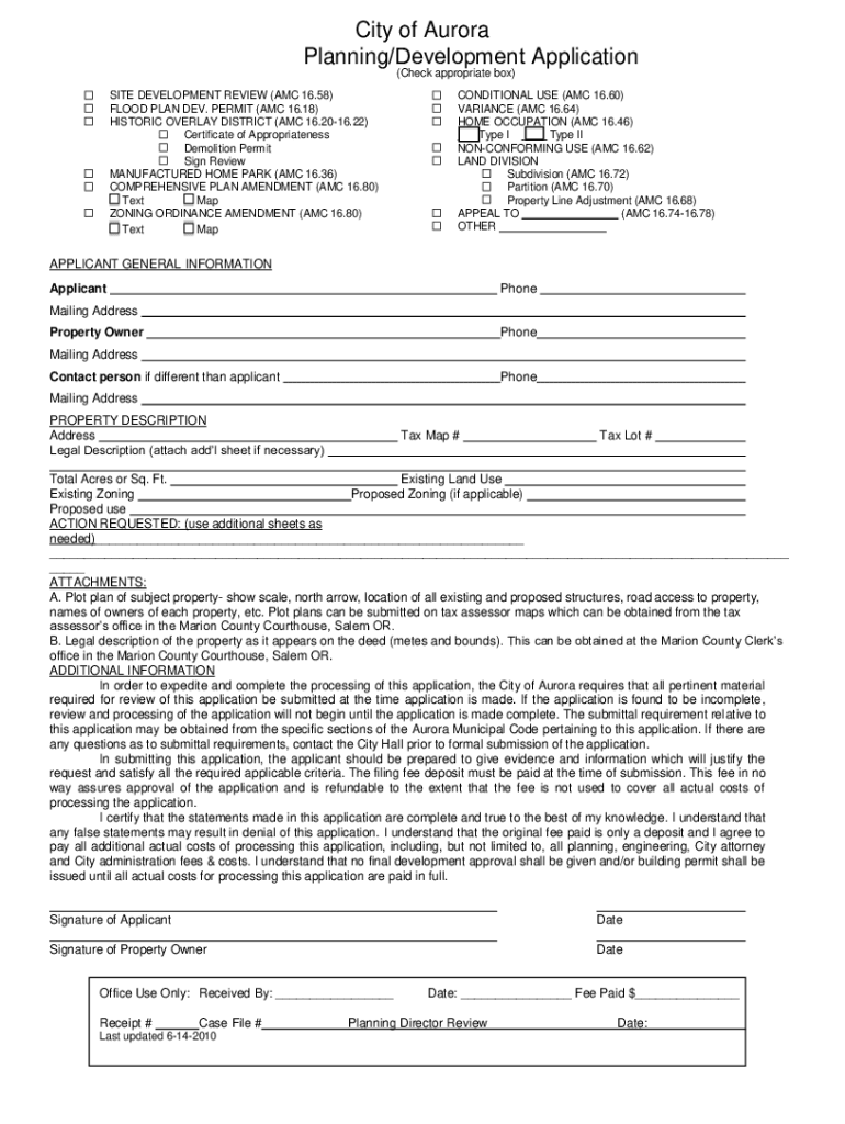 City of Aurora Planning/Development Application (Check appropriate box)SITE DEVELOPMENT REVIEW (AMC 16.58) FLOOD PLAN DEV. PERMIT (AMC 16.18) HISTORIC OVERLAY DISTRICT (AMC 16.2016.22) Certificate