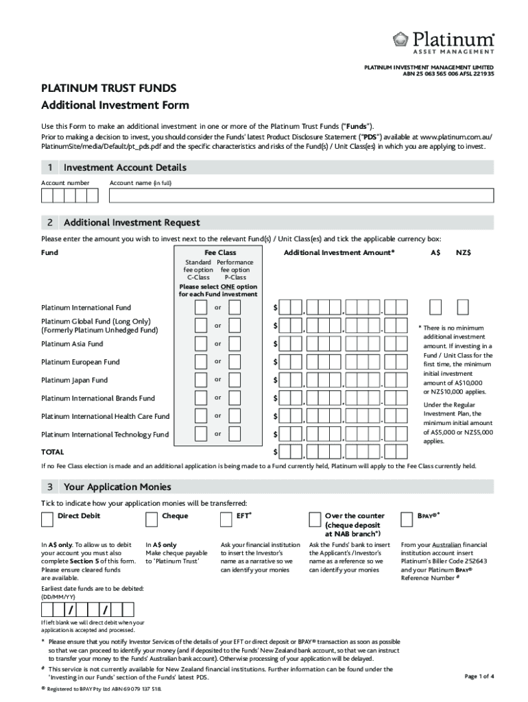 PLATINUM INVESTMENT MANAGEMENT LIMITED ABN 25 063 565 006 ADSL 221935PLATINUM TRUST FUNDS Additional Investment Form Use this Form to make an additional investment in one or more of the Platinum Trust