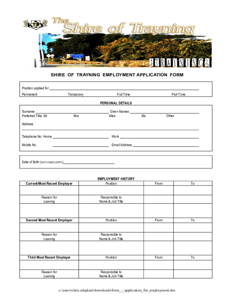 Shire Of Trayning Employment is not the form you're looking for?Search for another form here.