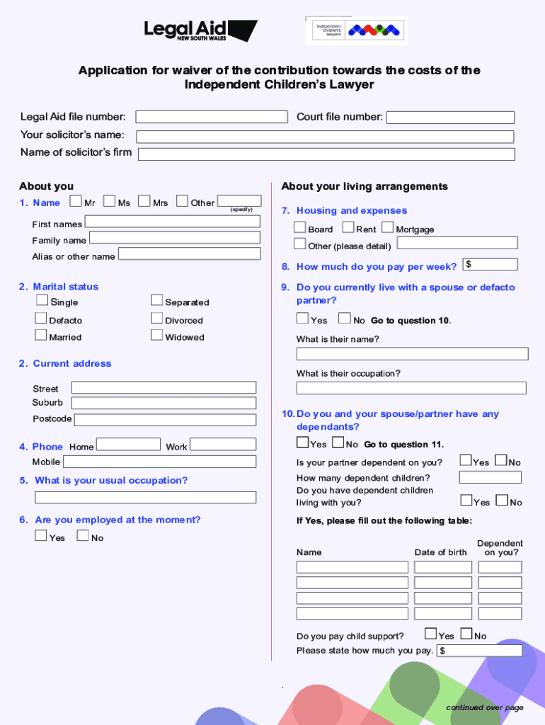 Application for waiver of the contribution towards the costs of the Independent Children's Lawyer Legal Aid file number:Court file number:Your solicitors name: Name of solicitors firm About you 1.