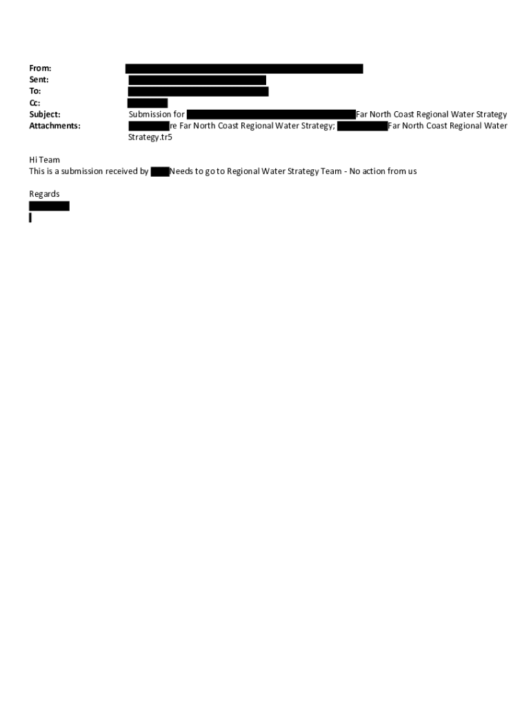 From: Sent: To: Cc: Subject: Attachments:Submission for re Far North Coast Regional Water Strategy; Strategy.tr5Hi Team This is a submission received by Regards North Coast Regional Water Strategy