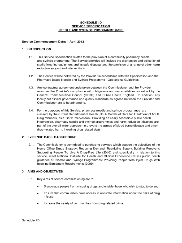 SCHEDULE 1D SERVICE SPECIFICATION NEEDLE AND SYRINGE Program (NSW)Service Commencement Date: 1 April 2013 1. INTRODUCTION 1.1. This Service Specification relates to the provision of a community pharmacy