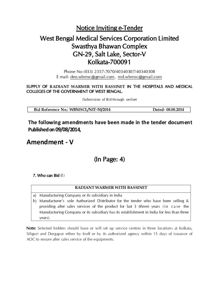 Notice Inviting tender West Bengal Medical Services Corporation Limited Swarthy Shawn Complex GN29, Salt Lake, Sector Kolkata700091 Phone No (033) 23577070/40340307/40340308 E mail: deo.wbmsc@gmail.com,