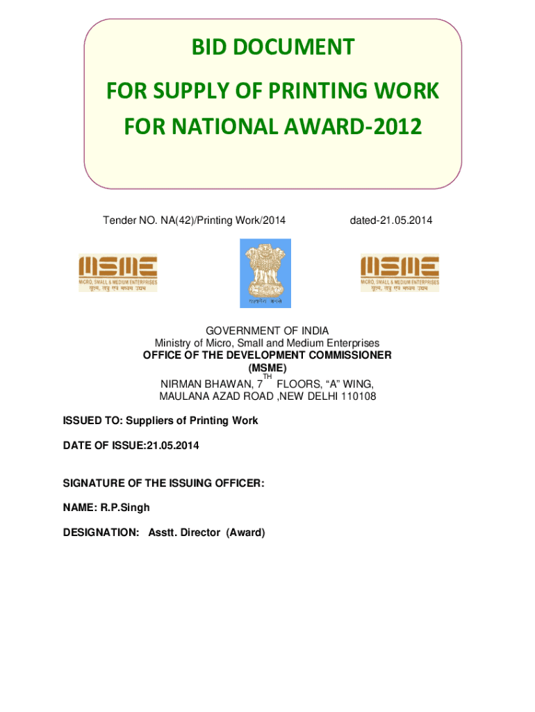 BID DOCUMENT FOR SUPPLY OF PRINTING WORK FOR NATIONAL AWARD2012Tender NO. NA(42)/Printing Work/2014dated21.05.2014GOVERNMENT OF INDIA Ministry of Micro, Small and Medium Enterprises OFFICE OF THE