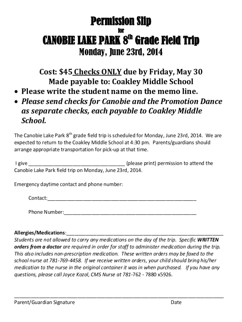 Get the free Permission Slip CANOBIE LAKE PARK 8th Grade Field Trip