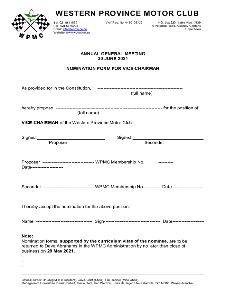 Get the free NOMINATION FORM - VICE-CHAIRMAN