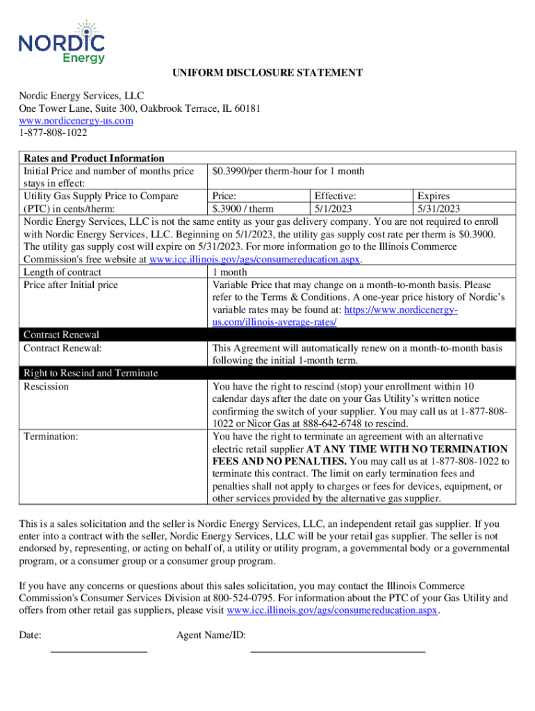 UNIFORM DISCLOSURE STATEMENT Nordic Energy Services, LLC One Tower Lane, Suite 300, Oak brook Terrace, IL 60181 www.nordicenergyus.com 18778081022 Rates and Product Information Initial Price and number