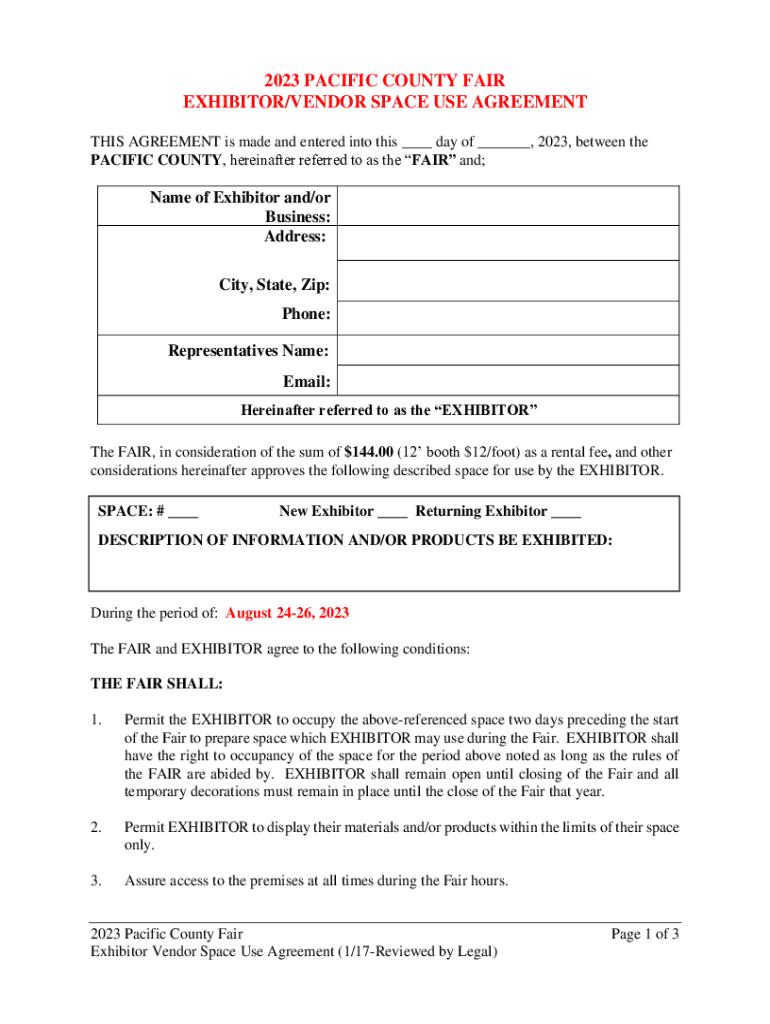 2023 PACIFIC COUNTY FAIR EXHIBITOR/VENDOR SPACE USE AGREEMENT THIS AGREEMENT is made and entered into this ___ day of ___, 2023, between the PACIFIC COUNTY, hereinafter referred to as the FAIR and;Name