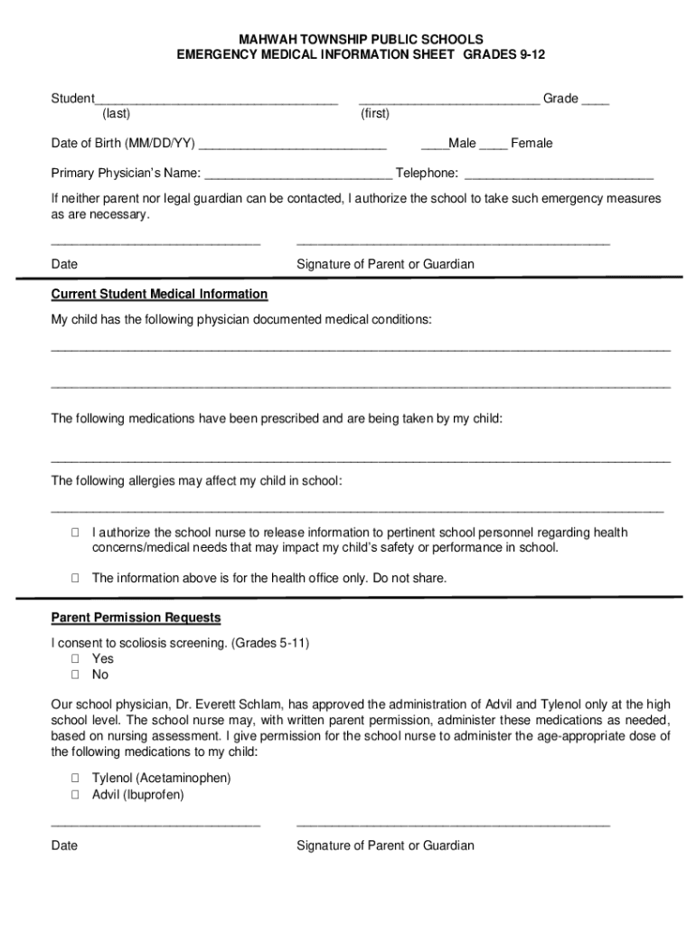EMERGENCY MEDICAL INFORMATION SHEET GRADES 912Student___