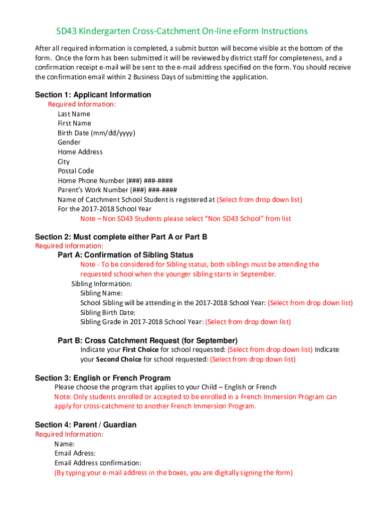 SD43 Kindergarten CrossCatchment Online form Instructions After all required information is completed, a submit button will become visible at the bottom of the form. Once the form has been submitted