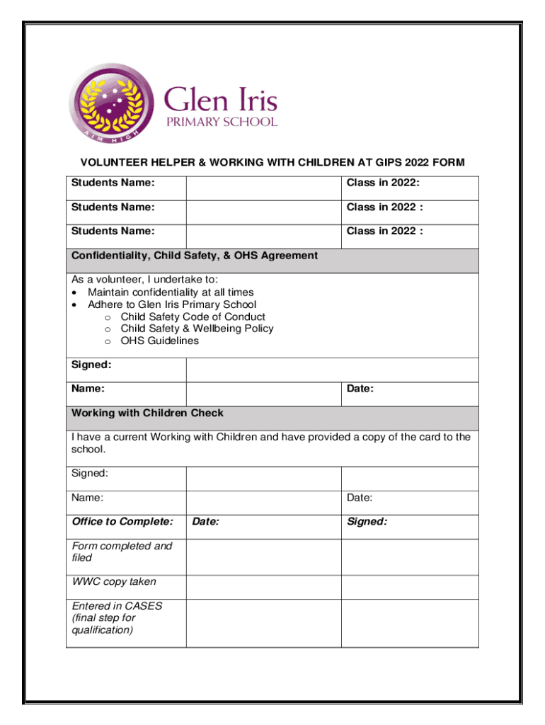 VOLUNTEER HELPER & WORKING WITH CHILDREN AT GPS 2022 FORM Students Name:Class in 2022:Students Name:Class in 2022 :Students Name:Class in 2022 :Confidentiality, Child Safety, & OHS Agreement As a